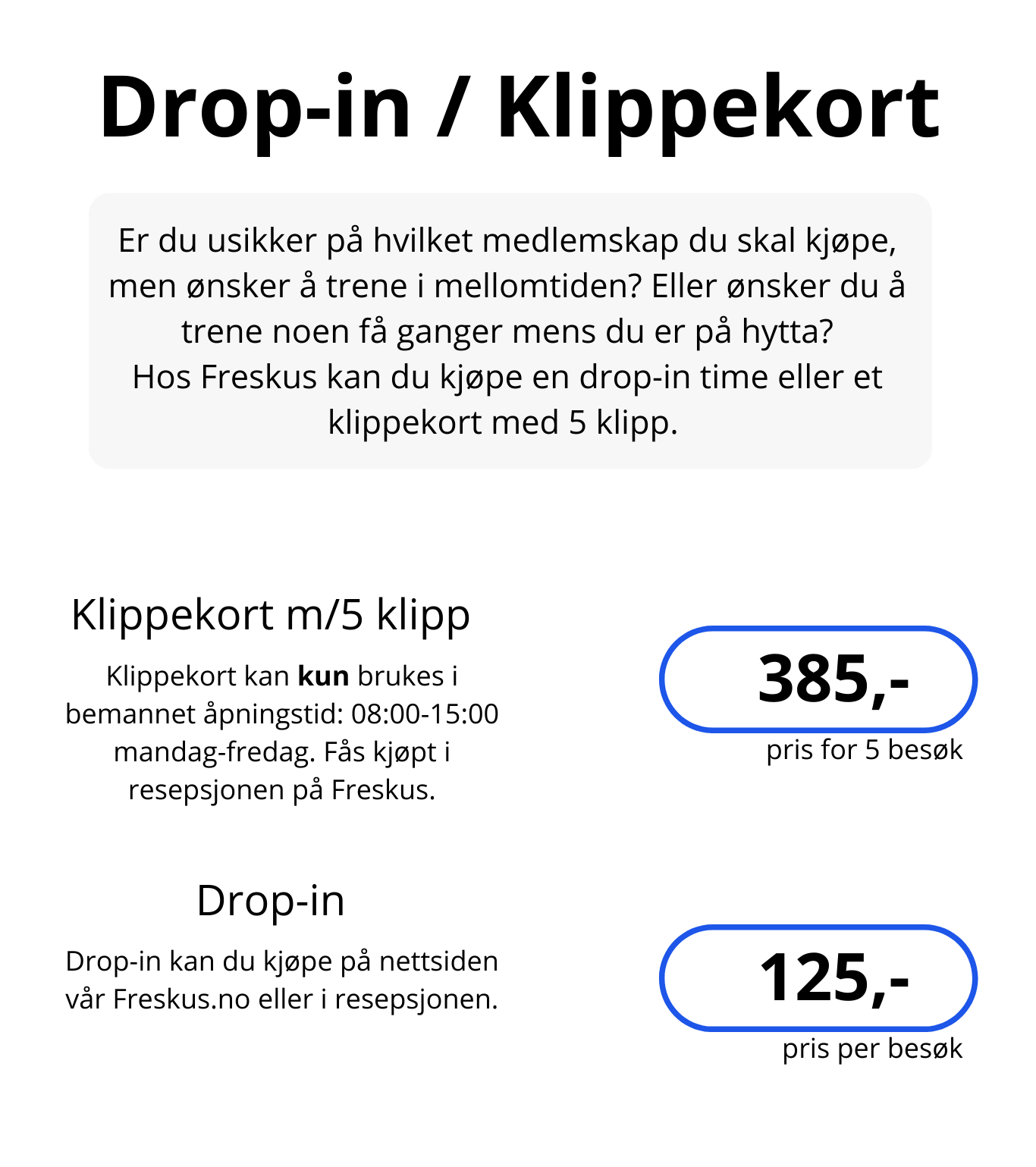 Freskus tilbyr flere ulike medlemskap, både med og uten bindingstid. Hos oss kan du også kjøpe klippekort og drop-in.