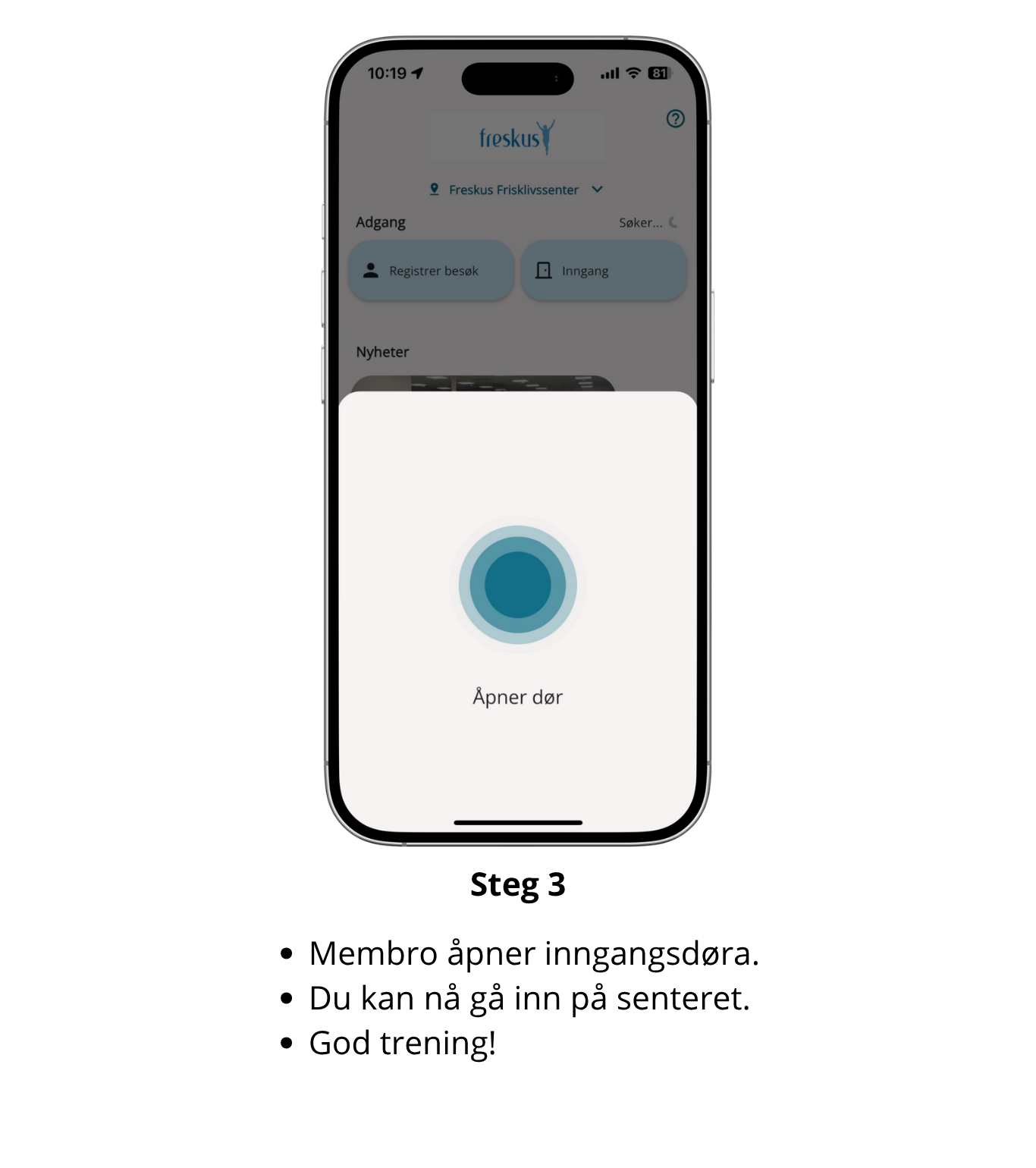 Last ned Membro, logg deg inn med telefonnummer, skriv inn koden du får på SMS og trykk på “Aktiver adgang”. Stå ved inngangsdøra til Freskus, appen søker automatisk opp døra og trykk på “Inngang” for å åpne.